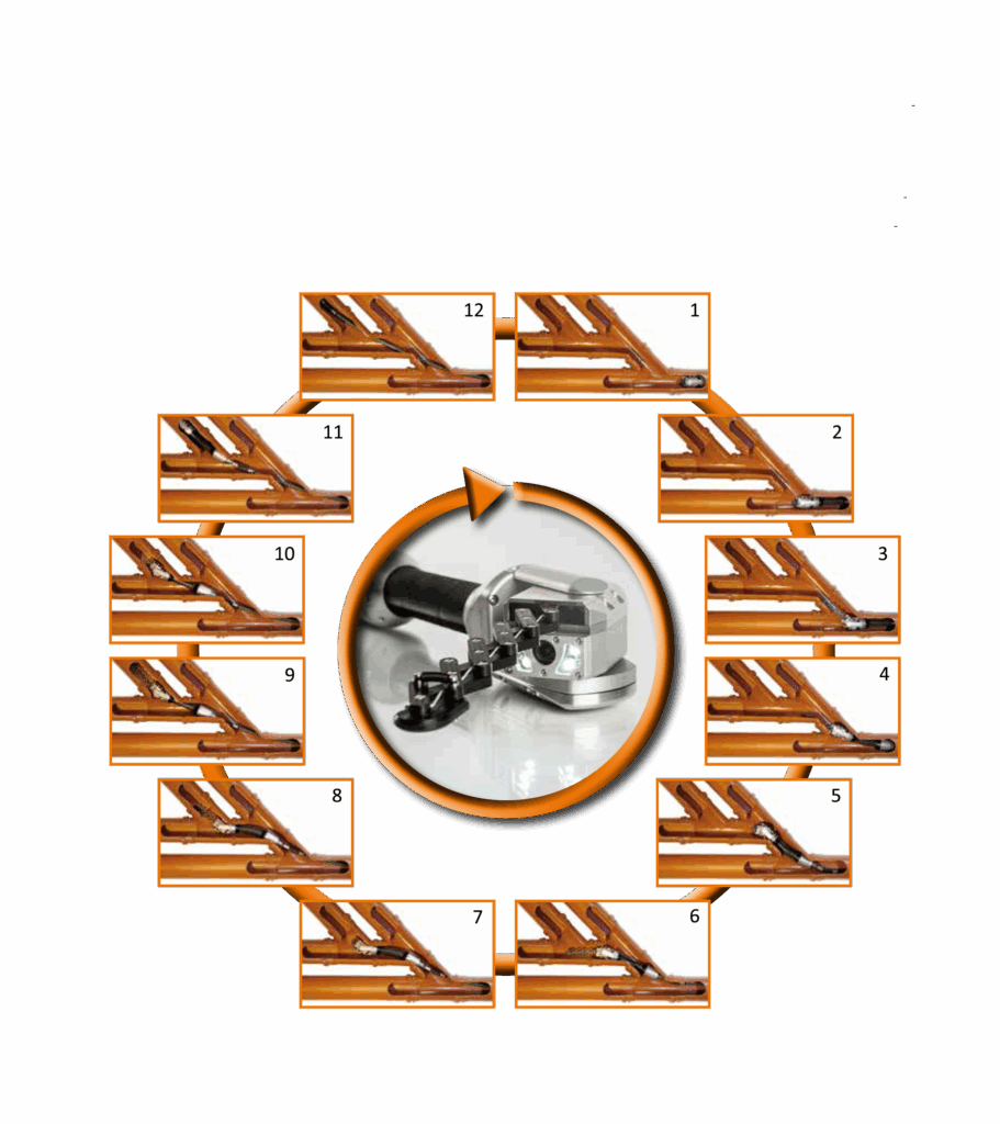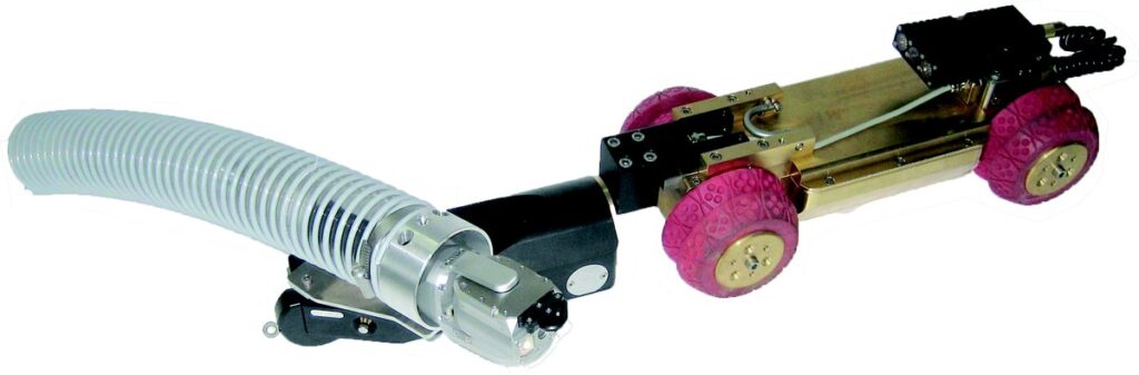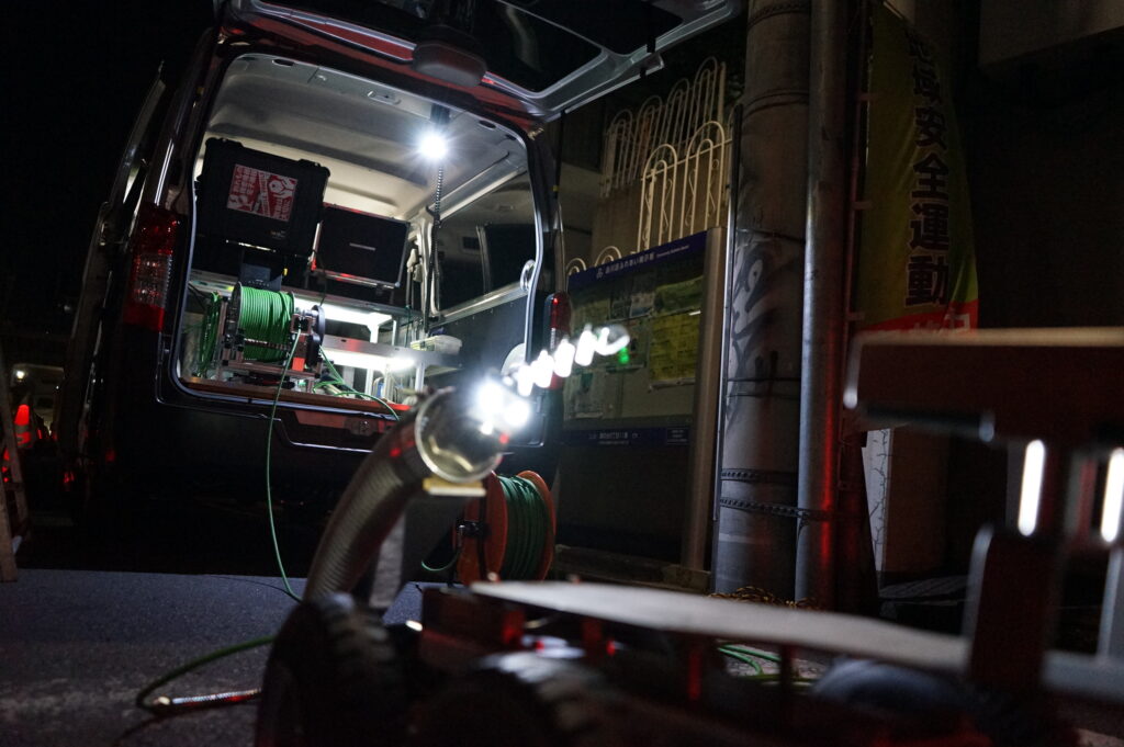 当研究会で保有するサテライト調査機材は、取付管内でも取付調査として長距離が行えるよう洗浄車の水圧を利用し推進力を得て前進していきます。またカメラの最大の特徴はカメラ前ぽに取付けられているシザー機能で様々な段差や分岐部での前進に非常に有効です。